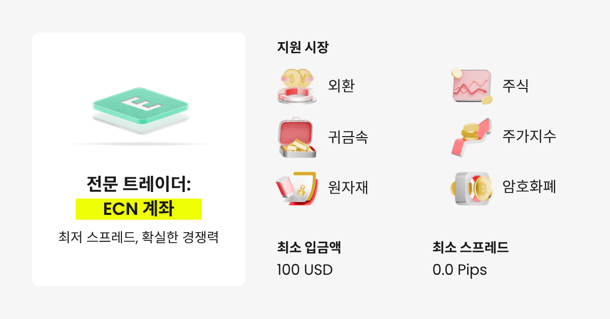 모든 계좌 유형 중에서 ECN 계좌는 가장 경쟁력 있는 가격 구조를 제공하는 것으로 알려져 있습니다.