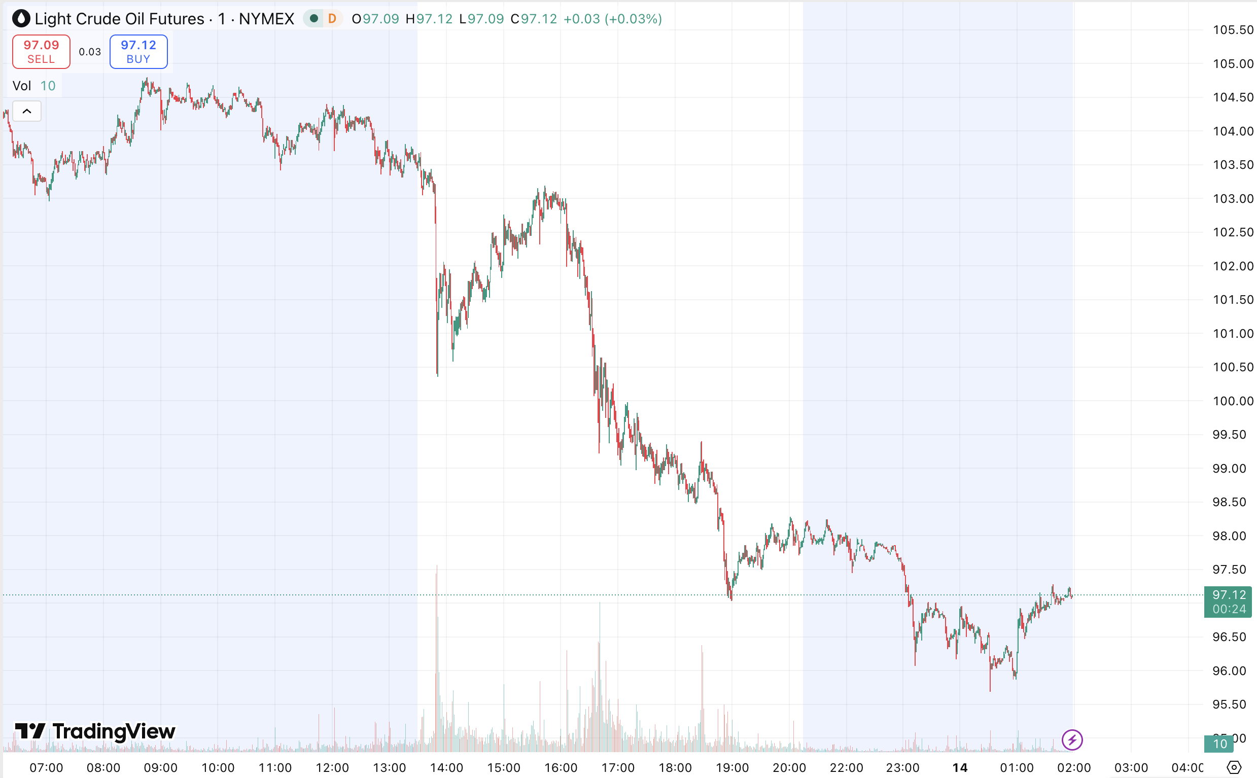 周二亚市早盘,现货黄金微涨,交投于 4760 美元/盎司附近,尽管美军宣布封锁阿曼湾及阿拉伯海,但在美伊谈判破裂后,双方接触仍在继续,据悉下一轮谈判或于 16 日在伊斯兰堡举行;美原油下跌超 2% ,交投于 97 美元/桶附近,日内或测试 95 美元/桶关口。