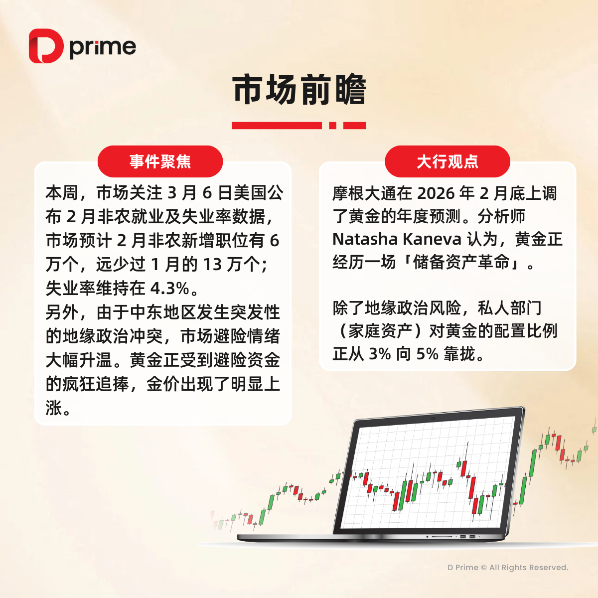 本周,美国 2 月非农数据来袭,美联储政策路径存疑,市场预计 2 月非农新增职位有 6 万个,远少过 1 月的 13 万个。 同时,由于中东地区发生突发性的地缘政治冲突,市场避险情绪大幅升温。 还有哪些大事值得关注?下方图片速览: