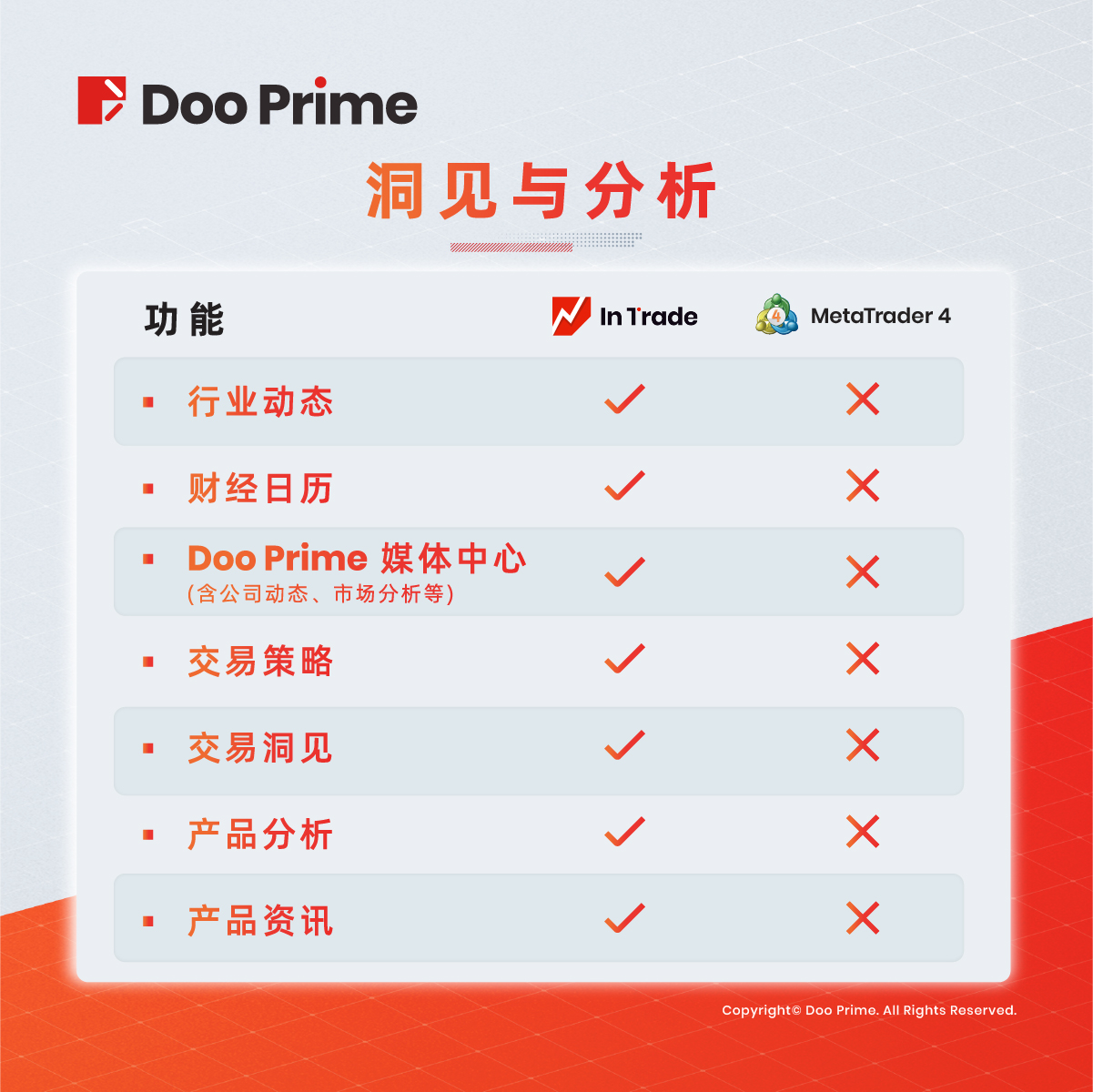 Doo Prime InTrade 比 MT4 有更多的优势和更便捷的操作功能,越来越多的客户喜欢 Doo Prime InTrade 的人性化界面和灵活性。