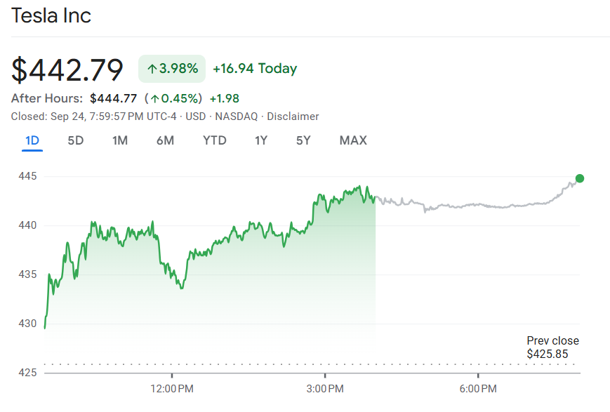 9 月 24 日至 25 日, 特斯拉(TSLA)股价周二逆市上涨 4%,因市场普遍预计第三季度交付量将显著上升。受美国 电动车税收抵免将在 9 月底到期的刺激,分析师认为消费者购车需求被大幅提前。
