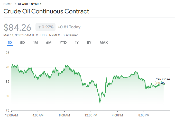 国际油价周二重挫,创下自 2020 年以来最大单日跌幅。西得州中质原油(WTI)下跌 12%,收于每桶约 83 美元。市场剧烈波动的主因在于霍尔木兹海峡运输形势传出相互矛盾的消息,导致投资情绪急剧反转。