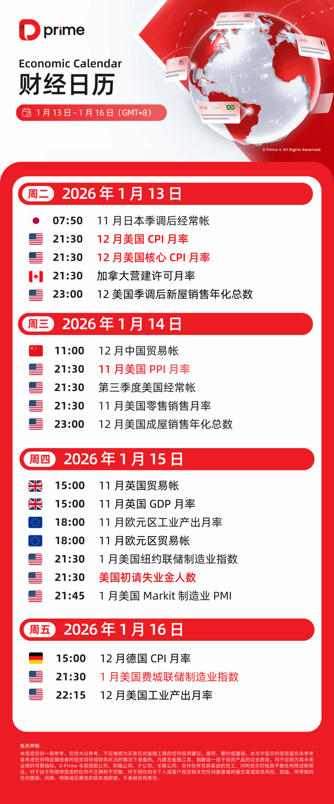 财经日历 | 以下为 2026 年 1 月 13 日至 2026 年 1 月 16 日(GMT+8 北京时间) 全球重大经济事件提醒。在重大行情期间,请确保您已审查您的保证金率,并有足够的保证金来支撑您的风险敞口。