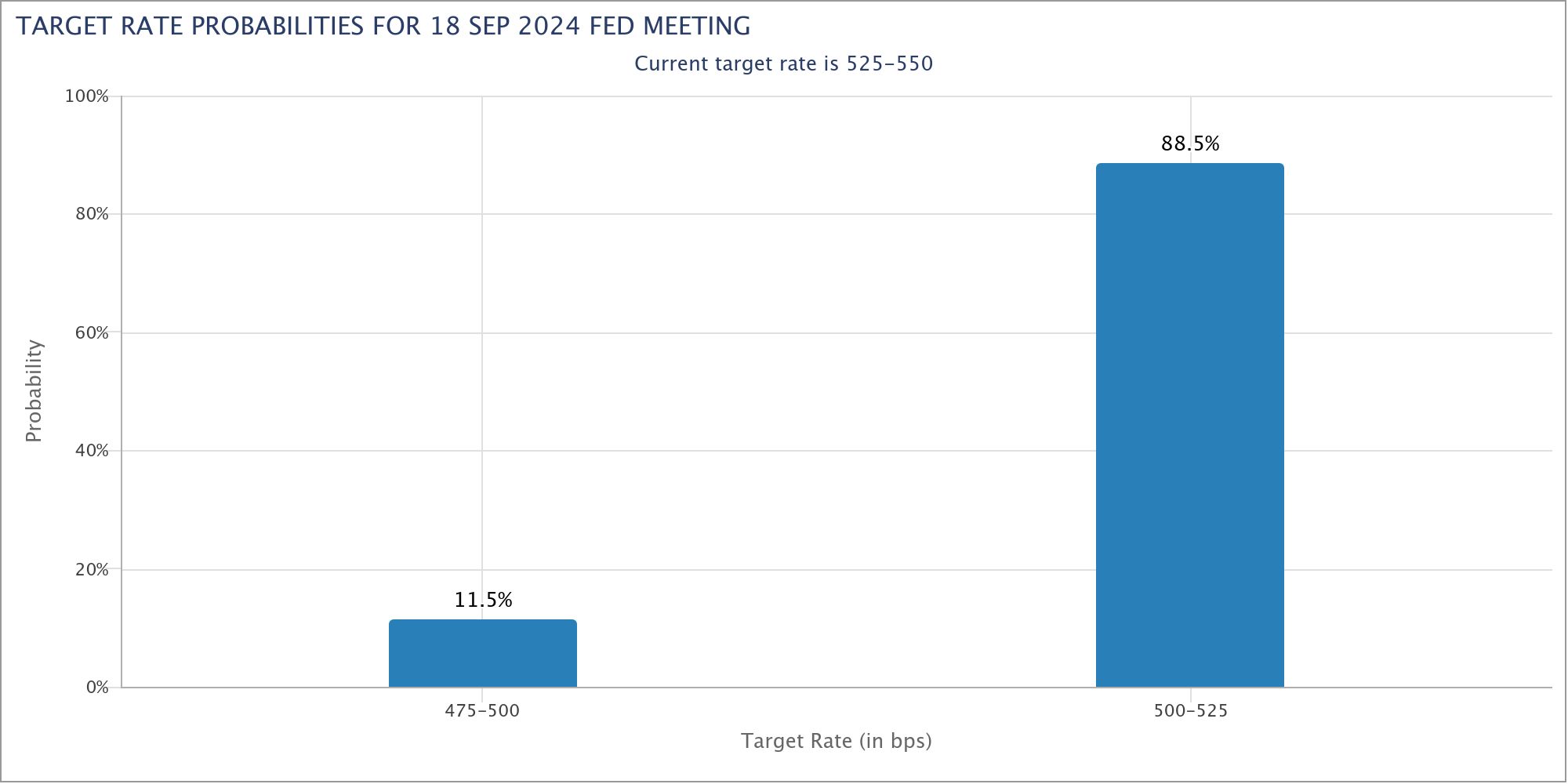 美国股市在美联储宣布利率维持不变后继续大幅上涨,道指一度涨 1%,最终收涨 0.24%;纳指涨超 2.6%,标普 500 指数涨 1.58%。联邦基金期货市场预计,美联储将在 9 月的会议上至少降息 25 个基点的可能性为 100%。