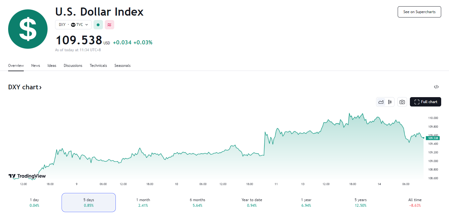 14 日,美元指数(DXY)前一交易日一度突破 110 整数关口,最高触及 110.18,上一次达到这一水平还是在 2022 年 11 月,随后有所回落,今日早盘再度突破 110 关口。