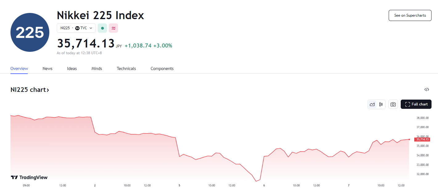随着日本央行就加息问题进行表态,日本股市强势拉升。7 日,在经历了周一暴跌和周二的暴涨后,今日日股似乎延续反弹趋势。日经 225 指数低开,并短线下挫,一度跌逾 3%,但随后强势拉升,涨逾 3%。