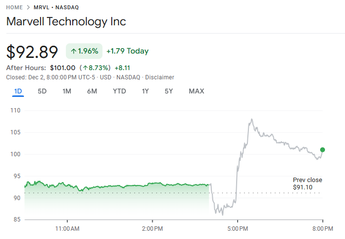 12 月 2 日至 3 日,迈威尔科技 Marvell (MRVL) 传出客制化芯片订单需求强劲,公司预期明年销售额有望增长约 20%,且不再出现此前的需求空窗期。同时,公司管理层表示,明年营收有望突破 100 亿美元,显著高于市场普遍预期,带动其盘后股价大涨逾 8.5%。