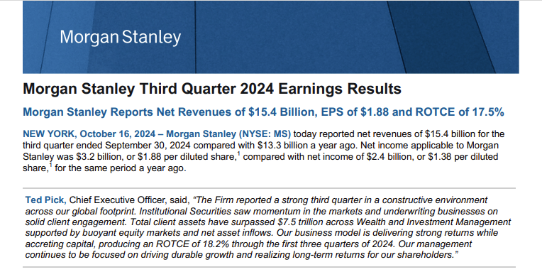 大摩 CEO Ted Pick 在新闻稿中表示,“在我们全球业务的良好环境背景下,公司第三季度业绩表现强劲。”