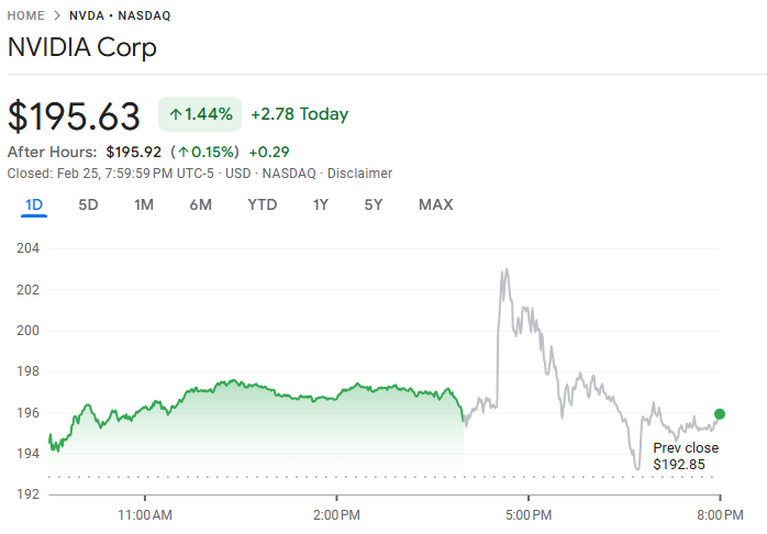 英伟达(NVDA)公布的第四财季业绩再度亮眼,营收同比飙升 73% 至 681.3 亿美元,每股收益(EPS)达 1.62 美元,均优于市场预期(分别为 662 亿美元与 1.53 美元)。公司 毛利率达 75.2%,略高于分析师一致预估。