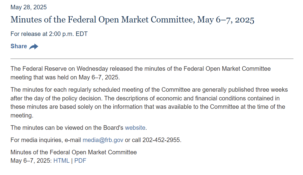 美联储发布 5 月货币政策会议的纪要。美联储官员认为,未来几个月他们可能面临“艰难的权衡”,因为失业率和通胀上升的风险都有所增加,这主要是因为特朗普关税政策引发的。这种情况可能会使美联储稳定物价和充分就业的目标相互矛盾,这将迫使委员们决定,是优先收紧货币政策来对抗通胀,还是通过降息来支持经济增长和就业。