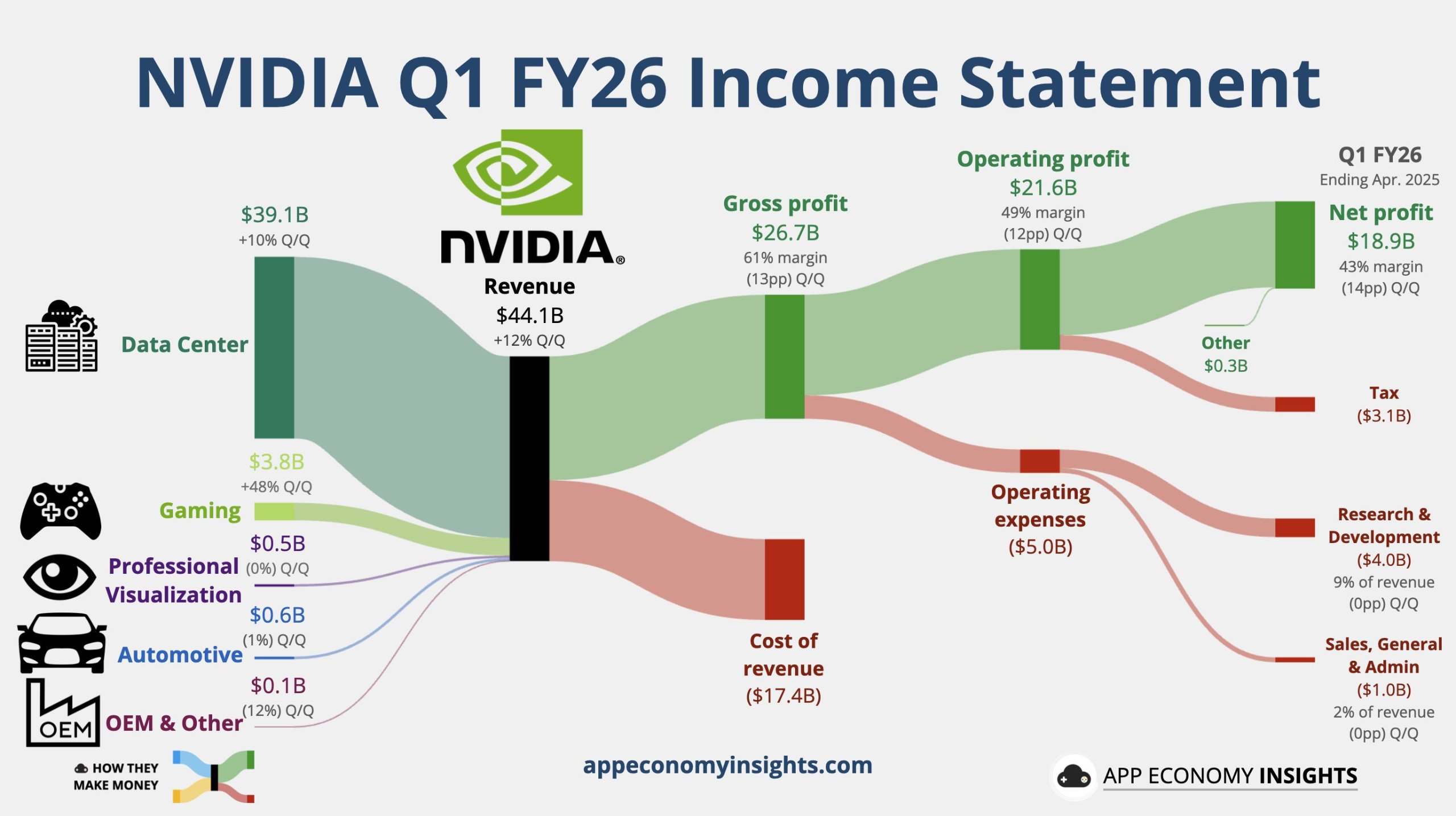 - 英伟达第一财季整体营收同比增长 69%,达到 441 亿美元,高于市场预期的 431 亿美元;