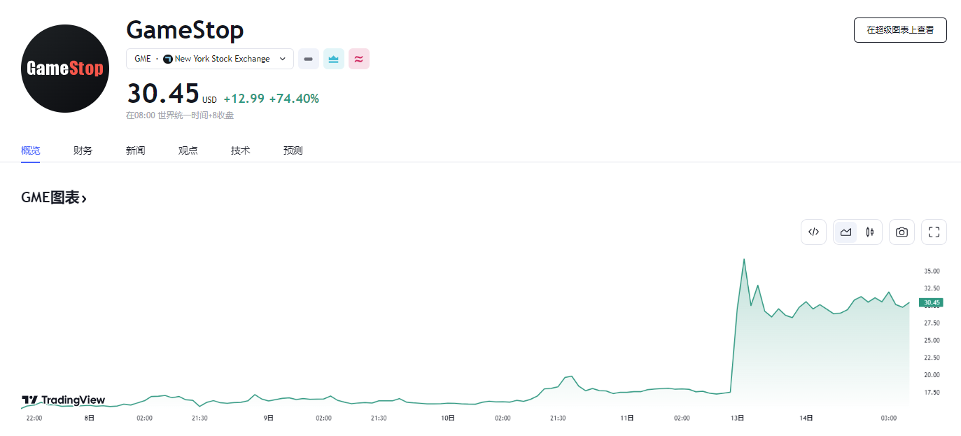 游戏驿站股票盘中数次触及熔断,一度飙升逾 110%,最终收涨 74.4%,报 30.45 美元,创下 2021 年以来最大单日涨幅;该股盘后续涨超 22%。AMC 暴涨 79.73%,截至发稿盘后续涨 24%;“散户大本营”Reddit 上涨 8.78%,盘后续涨 2%。