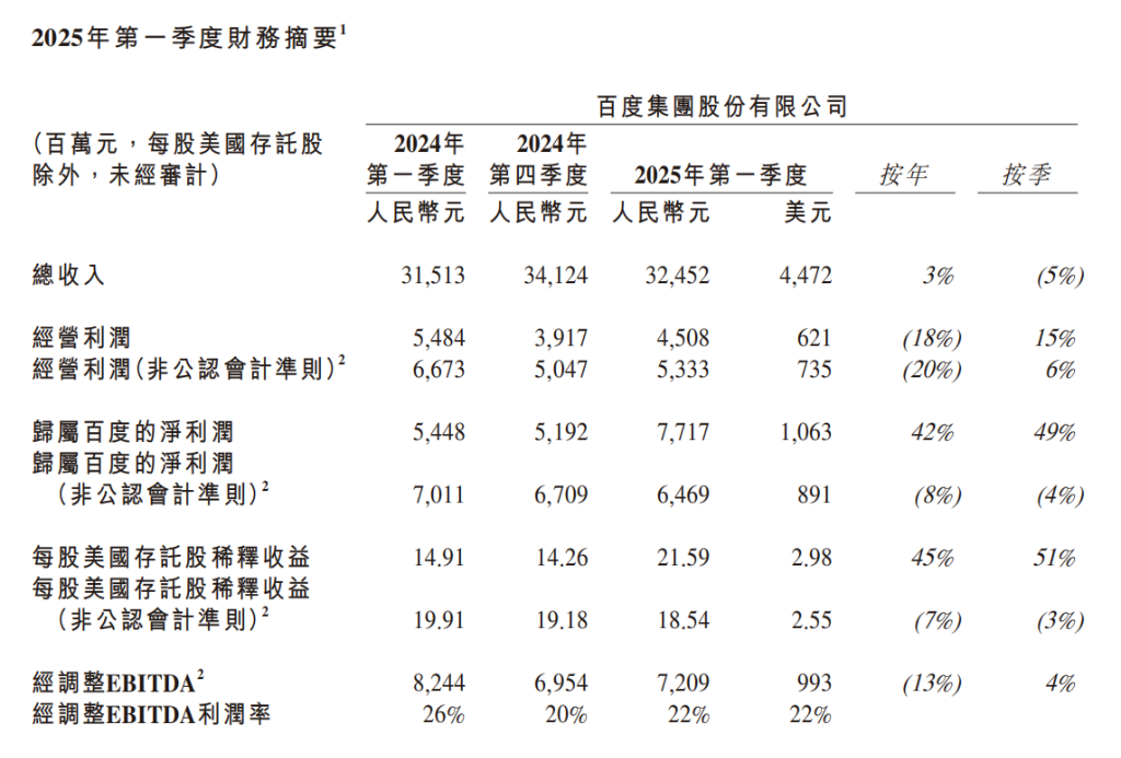 - 第一季度营收 324.5 亿人民币(约 44.7 亿美元),同比增长 3%,高于预估 310.3 亿元