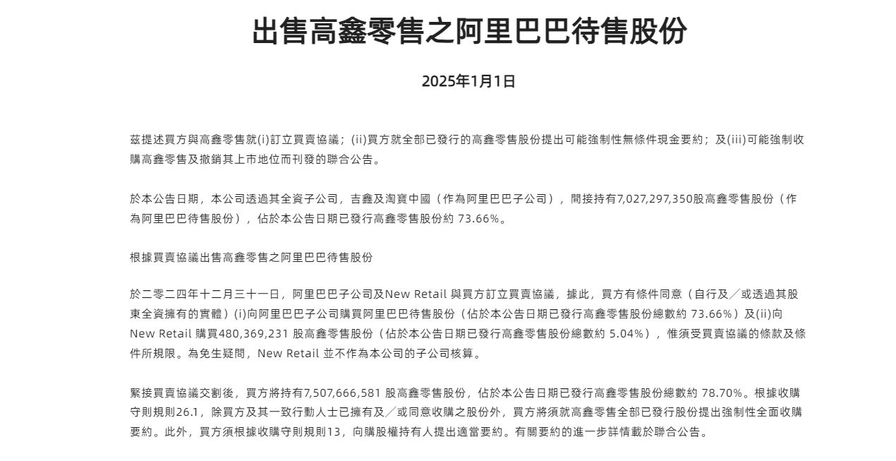 1 月 1 日,阿里巴巴集团发布公告称,子公司及 New Retail 与德弘资本达成交易,以最高约 131.38 亿港元出售所持高鑫零售全部股权,合计占高鑫零售已发行股份的 78.7%。