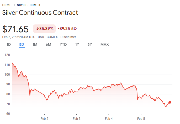 周四现货白银盘中一度暴跌 20%,跌破每盎司 71 美元关口;周五亚洲时段跌势延续。自上周触及历史高点以来,银价累计回落超过三分之一。历史波动率指标飙升,市场震荡程度创下 1980 年以来纪录。