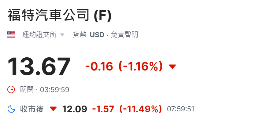 (福特表示由于质量问题下调了福特蓝色部门的预期。受消息影响,福特股价盘后暴跌近 12%。)