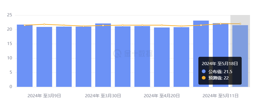 同日,美国劳工部公布,截至 5 月 18 日当周,首次申领失业救济金人数减少了 0.8 万人至 21.5 万人,略低于市场预测的 22 万人,创下 9 月份以来的最大连续两周降幅,此前一周的首申数据也出现了类似的下降。