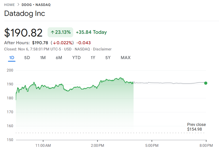 11 月 6 日至 7 日,云端监控龙头 Datadog(DODG)股价周四大涨 23.13%,收报 190.82 美元,创下自 2011 年 11 月 16 日以来的四年新高。该股单日上涨 35.84 美元,扭转前三个交易日累计下跌 4.8% 的颓势,同时成为标普 500 与纳斯达克 100 涨幅榜双冠王,今年以来累计上涨 33.54%。