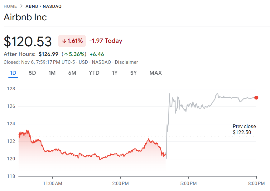 11 月 6 日至 7 日,Airbnb(ABNB)公布 2025 年第三季度财报,营收同比增长 9.7% 至 40.9 亿美元,略高于市场预期的 40.8 亿美元;每股收益(EPS)为 2.21 美元,低于市场预期的 2.31 美元。