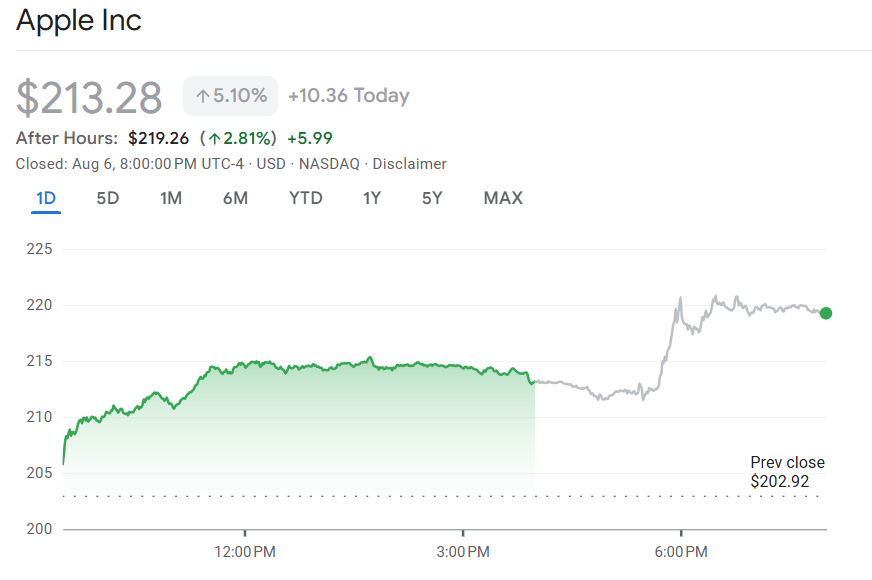 苹果追加 1000 亿在美投资额,股价单日暴涨 5%,创 5 月来最大涨幅