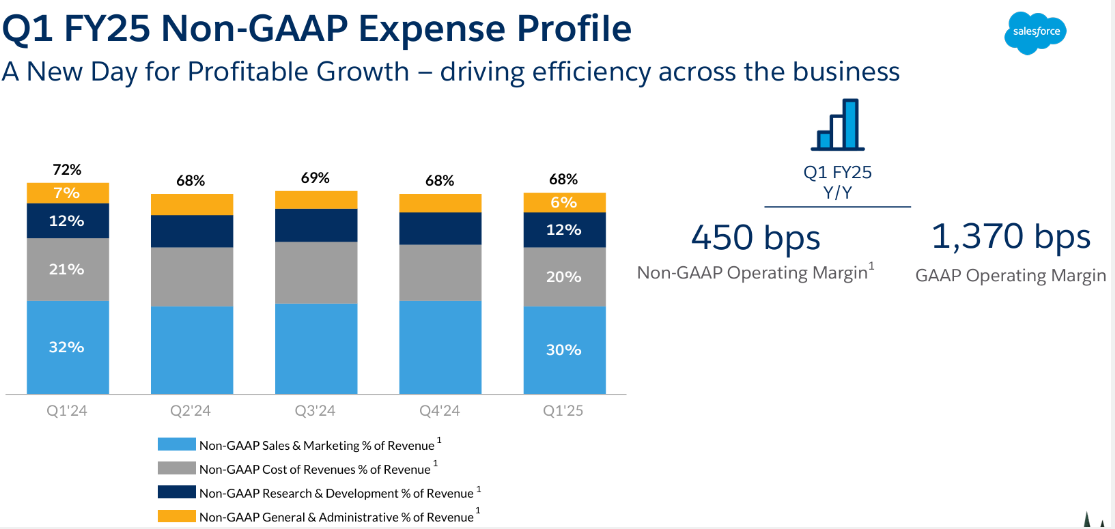 Salesforce(CRM)第一季度营收增长 11%,达到 91.3 亿美元,首次自 2006 年以来低于分析师预期的 91.7 亿美元。Non-GAAP 每股收益为 2.4 美元,超过财务预测的 2.38 美元以及市场共识。此外,在持续削减成本的效果下,Non-GAAP 营业利润率达到历史新高的 32.1%。然而,Salesforce 最新展望显示运营增长势头放缓,导致股价暴跌 19%,可能创下自 2008 年以来最大单日跌幅。