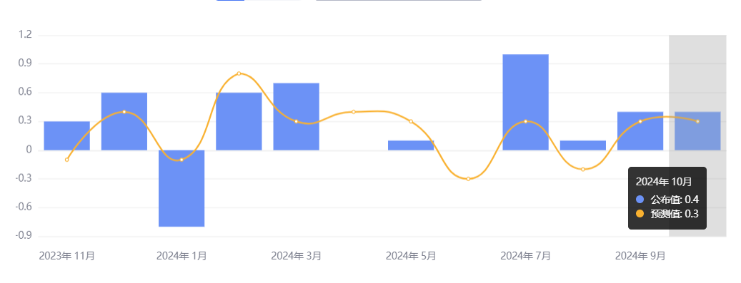 11 月 15 日,美国商务部公布,10 月零售销售数据环比增速 0.4%,高于预期 0.3%;9月前值从 0.4% 大幅上修至 0.8%,不过 8 月数据被下修至下降 0.1%。