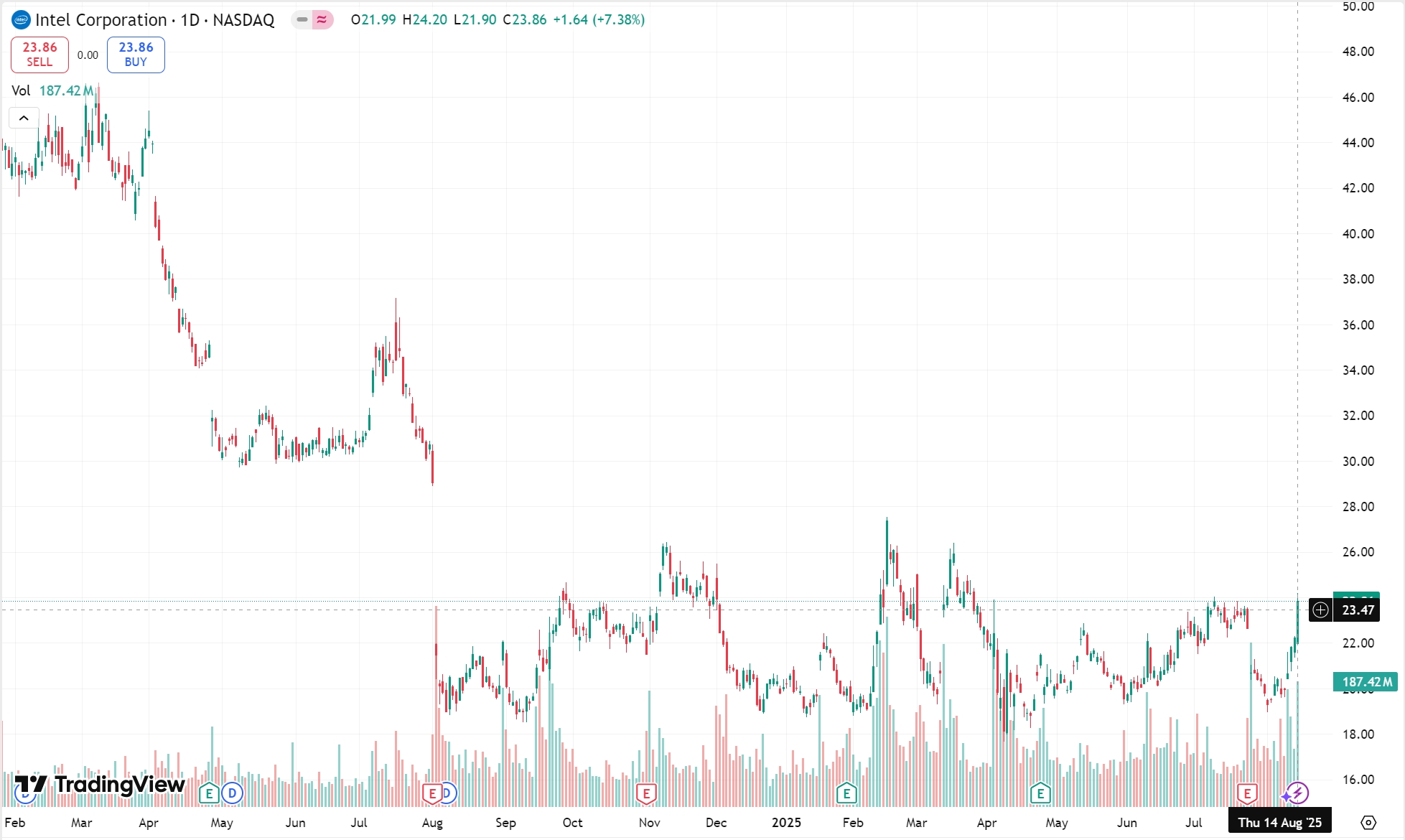 据彭博社报道,知情人士透露称,特朗普政府正与英特尔公司(INTC)商讨由政府入股这家处境艰难的芯片制造商。受此消息影响,英特尔股价周四盘中一度涨近 9%,收涨超 7%,盘后续涨超 4%。