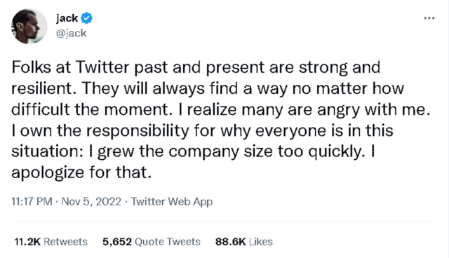 推特联合创始人杰克·多尔西( Jack Dorsey )在今年 4 月曾在推特称赞马斯克接管公司是 “我唯一信任的解决方案”,并称马斯克的目标是创建一个 “最受信任和广泛包容的平台,这是正确的”。大规模裁员行动发生后,多尔西在 11 月 5 日就此事向员工道歉,“过去和现在的推特员工都很坚强,很有弹性。无论多么困难的时刻,他们总会找到办法。我知道很多人生我的气,所有人都处于被裁员的情况。我把公司规模扩大得太快,我很抱歉。”