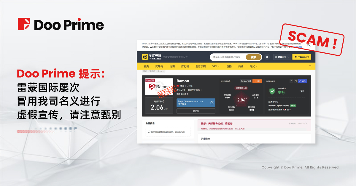 近日,Doo Prime 收到反馈获悉,雷蒙国际有限公司(Ramon Capital Limited,以下简称雷蒙国际)再次私自冒用我司名义进行虚假宣传,企图误导客户,对我司声誉及客户资金安全造成影响。