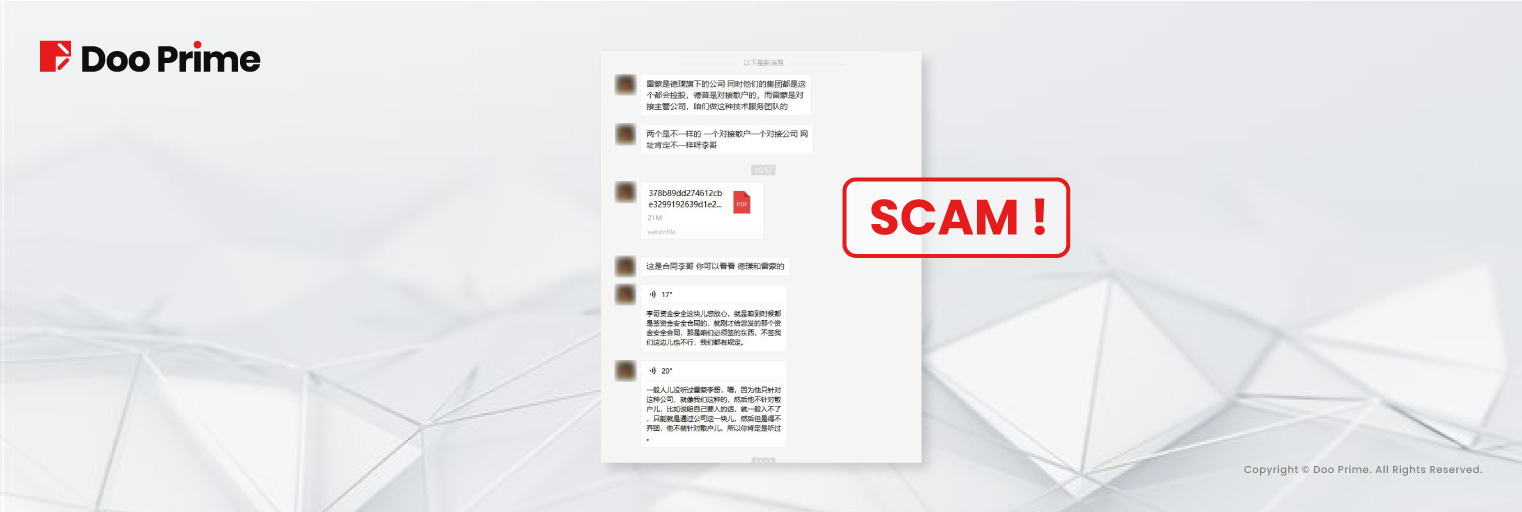 鉴于多次出现未经授权的公司冒用 Doo Prime 名义作非法宣传的行为,为避免个人权益受到侵害,我们建议广大投资者通过官方渠道获取我司的信息和服务。如遇到任何可疑情况,请立即通过以下方式联系客户经理反馈或咨询。