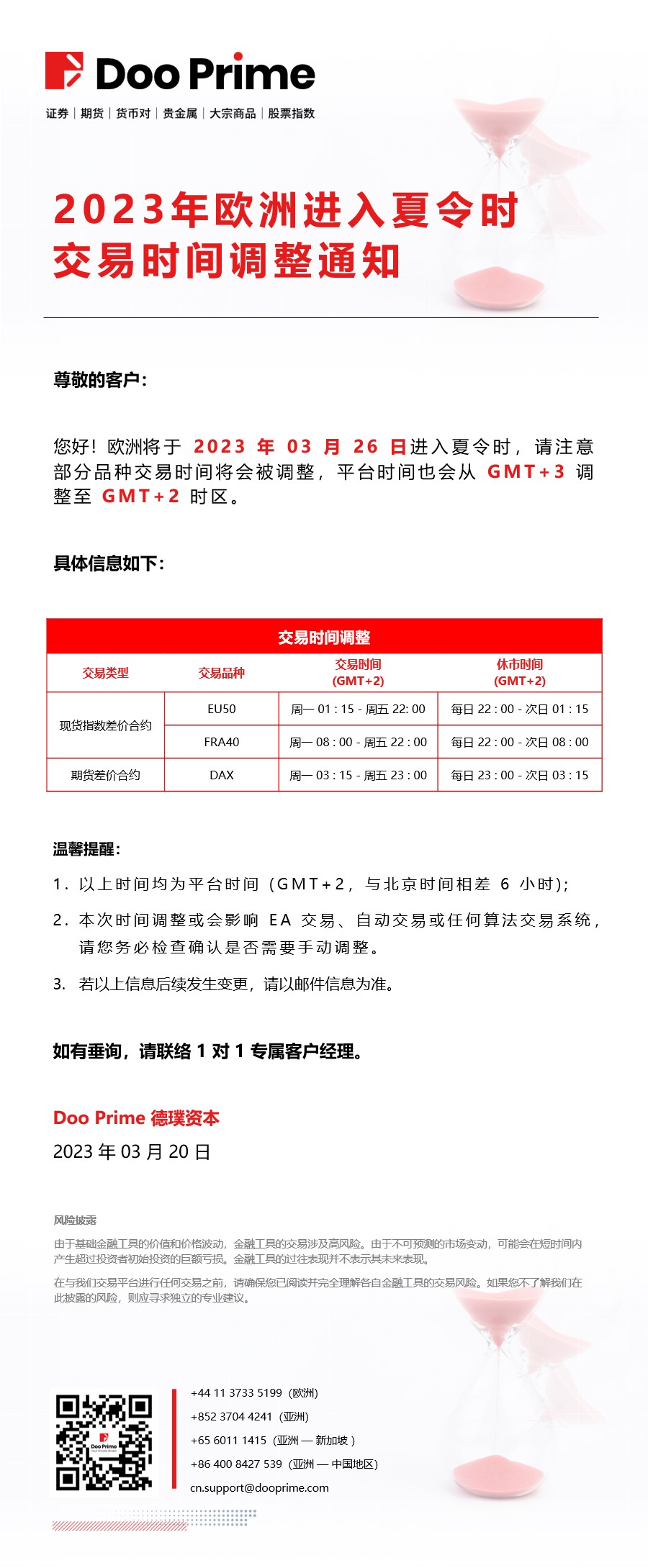 2023-03-20 | 交易时间调整 , 产品消息 , 欧洲夏令时 , 重要通告