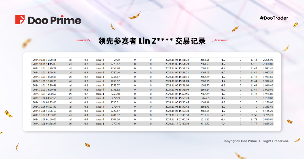 2024 年注定成为黄金市场的重要篇章,在剧烈波动的行情中,市场充满了前所未有的交易机会。从宏观经济变化到地缘政治风险,每一个驱动因素都为黄金价格注入了巨大的不确定性,同时也为敏锐的交易者提供了无限可能。大师组排名第一的 Lin Z **** 就牢牢抓住了机会,在比赛过程中展现了专业交易员的风采。