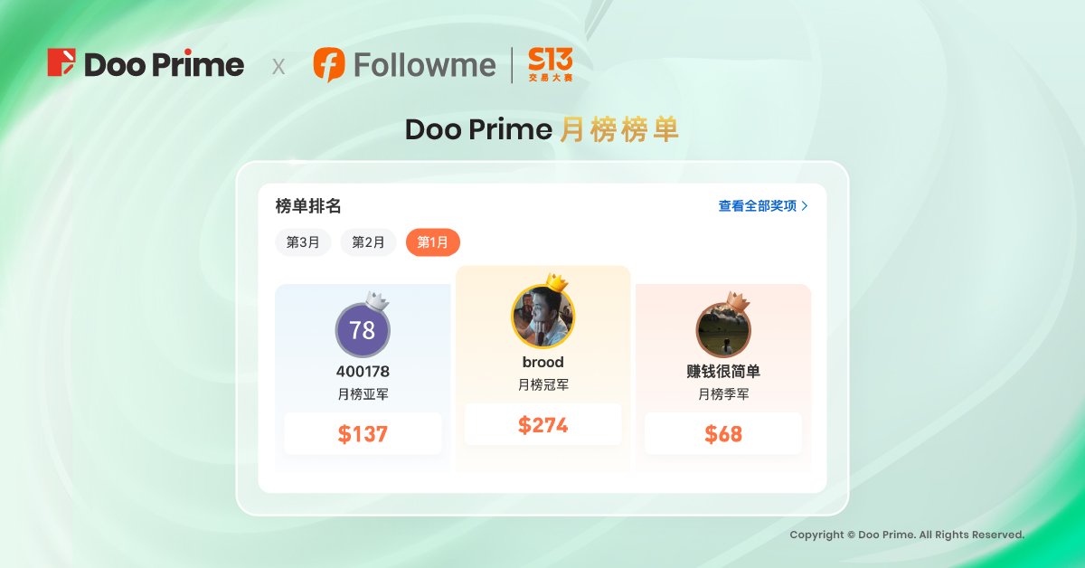 FOLLOWME S13 交易大赛收官,Doo Prime 选手喜赢新手组冠军!