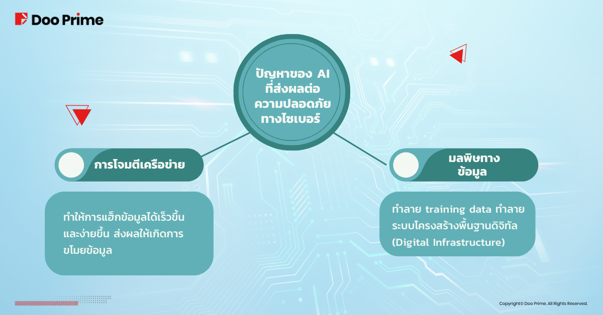 • แฮกเกอร์สามารถใช้ประโยชน์จาก AI เพื่อออกแบบ รันโค้ดที่ก่อกวน และใช้ข้อมูล Training Data เพื่อสร้างเวกเตอร์การโจมตีใหม่ๆ