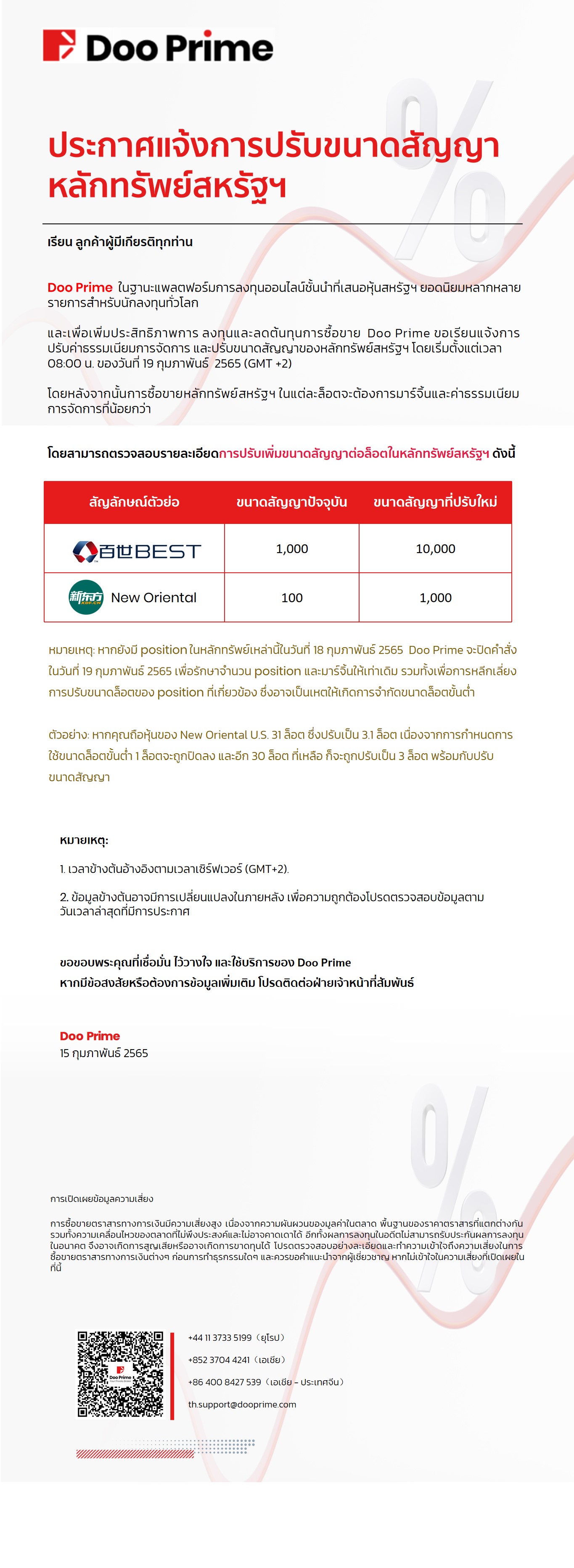 Doo Prime ประกาศแจ้งการปรับขนาดสัญญาในหลักทรัพย์สหรัฐฯ