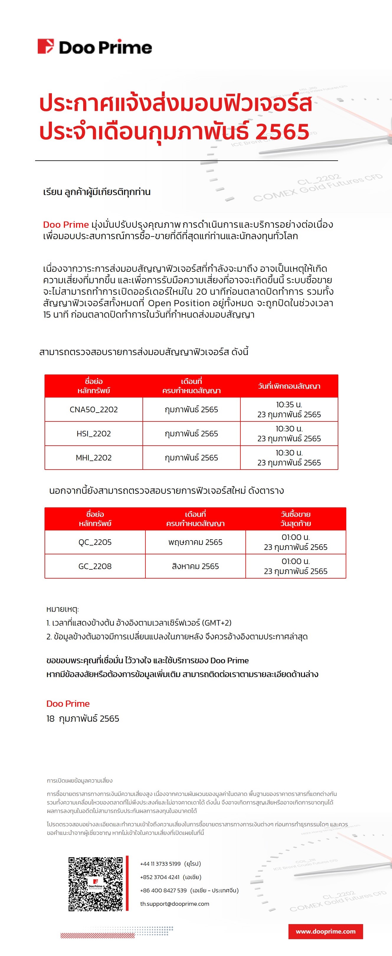 Doo Prime ประกาศแจ้งการส่งมอบฟิวเจอร์สประจำเดือนกุมภาพันธ์ 2565
