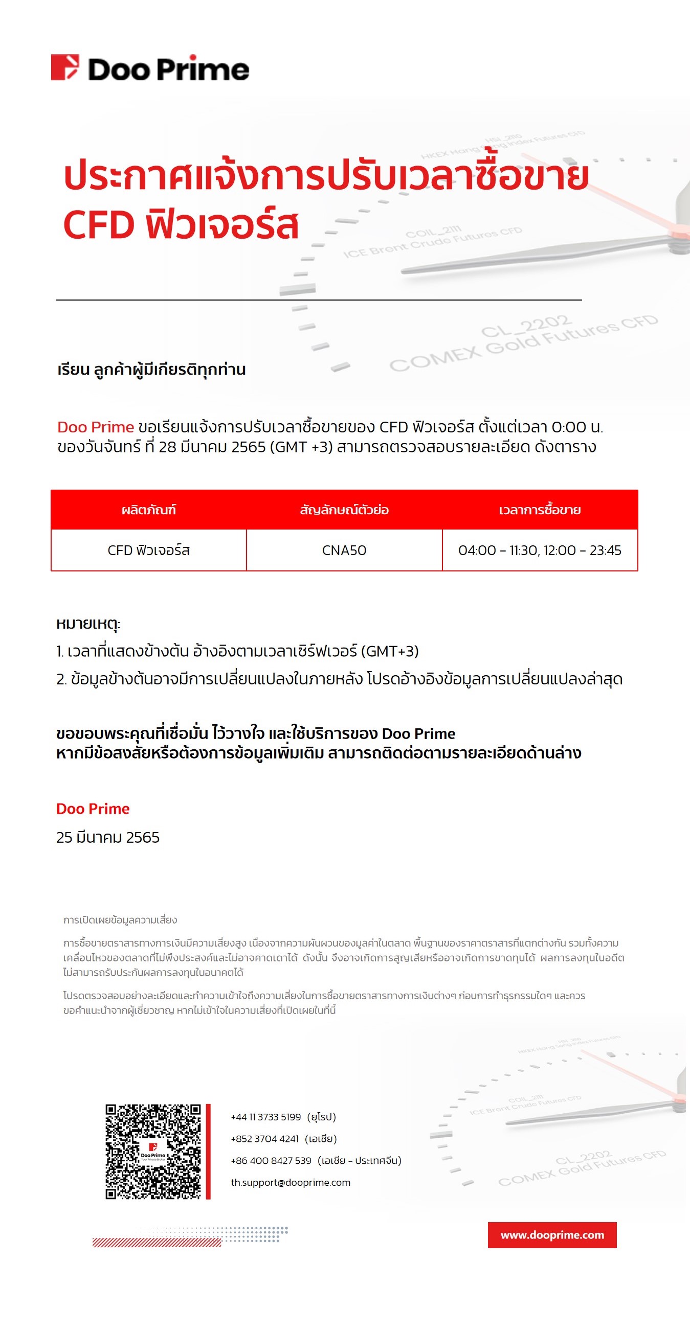 Doo Prime ประกาศแจ้งปรับเวลาการซื้อขาย CFD ฟิวเจอร์ส