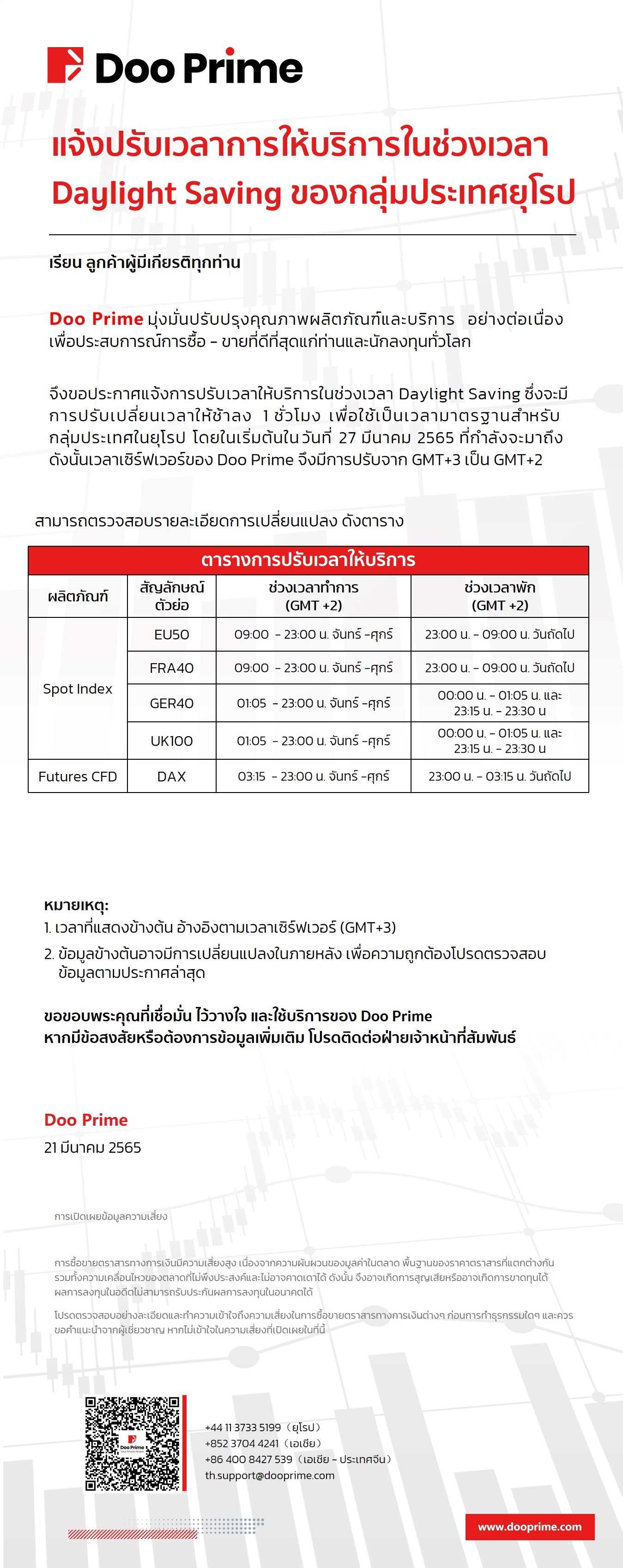 Doo Prime แจ้งปรับเวลาให้บริการในช่วงเวลา Daylight Saving ของสหภาพยุโรป 2565
