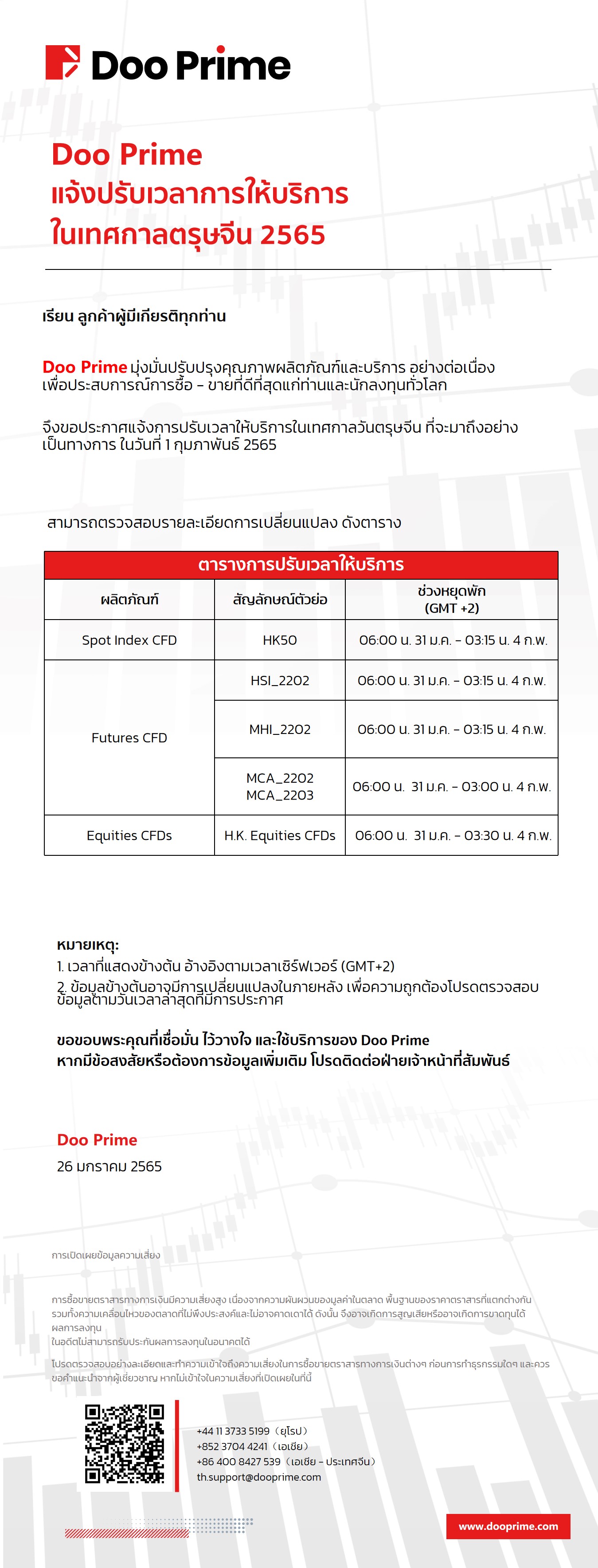 Doo Prime แจ้งปรับเวลาให้บริการในเทศกาลวันตรุษจีน 2565