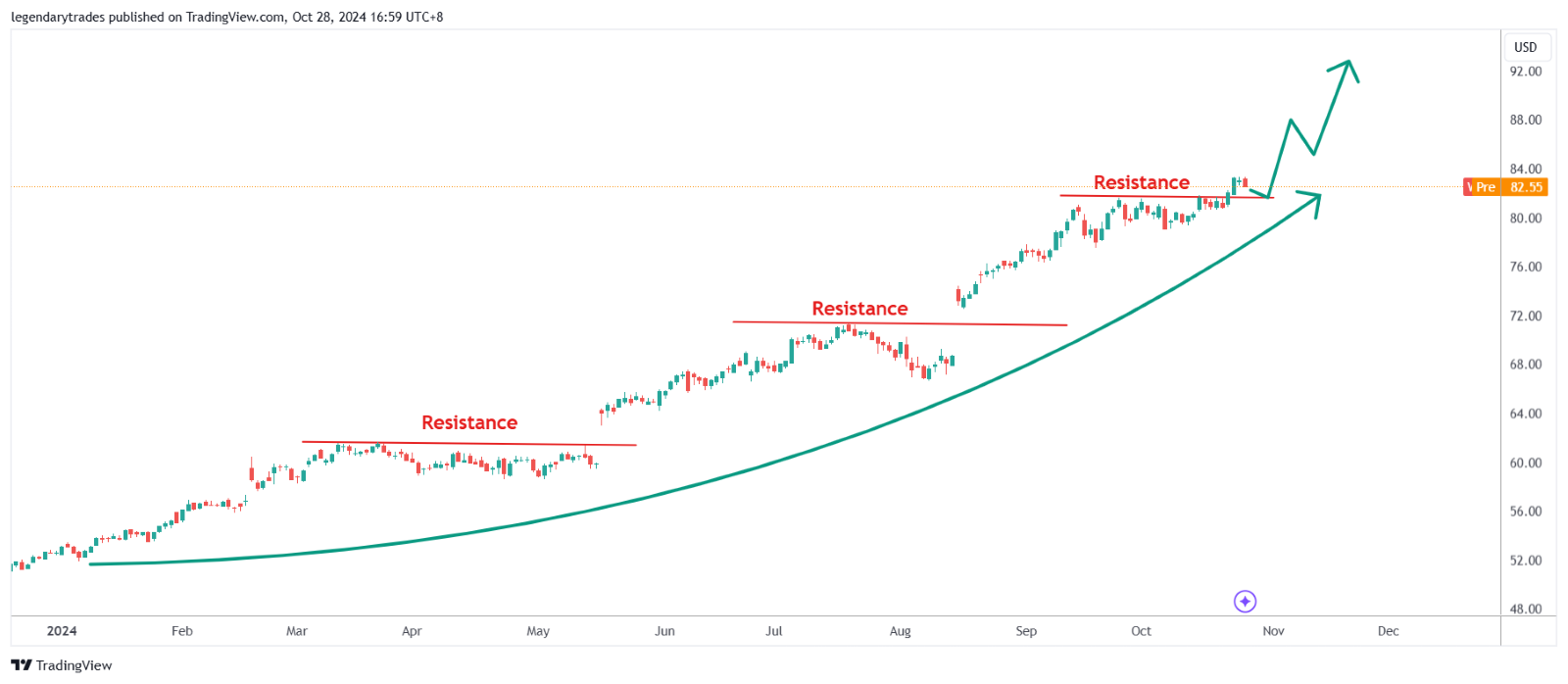 จากมุมมองทางเทคนิค ราคาหุ้นของ Walmart มีแนวโน้มสูงขึ้นอย่างต่อเนื่อง โดยสามารถผ่านระดับแนวต้านได้อย่างมั่นคง แตกต่างจาก Amazon ที่รายงานผลประกอบการไตรมาส 3 จะออกมาในวันที่ 19 พฤศจิกายน ดังนั้นจึงมีโอกาสน้อยที่เราจะเห็นราคาพุ่งสูงขึ้นทันที Walmart อาจทำให้ราคาค่อย ๆ ขึ้นไปสู่ระดับสูงสุดใหม่ในอนาคต