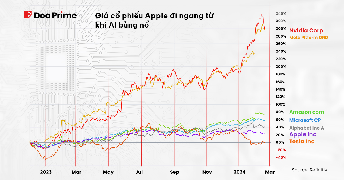 Trong cuộc đua về trí tuệ nhân tạo, giá cổ phiếu của Apple có hiệu suất chậm hơn các đối thủ còn lại. Nvida (NVDA), Meta (META), Microsoft (MSFT) và Amazon (AMZN) đã và đang dẫn đầu làn sóng AI hiện tại.